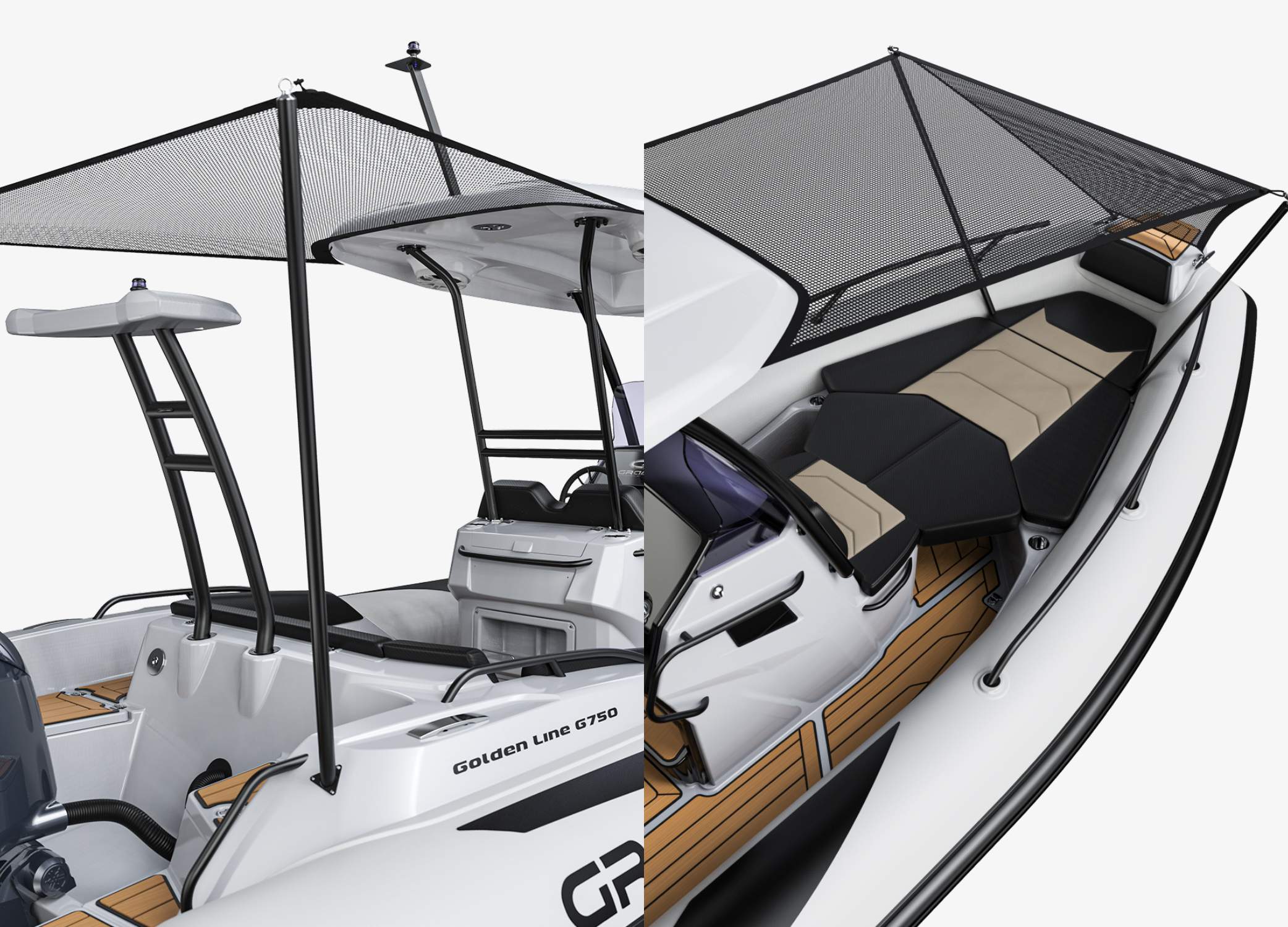 Embarking and mooring can be done comfortably and confidently thanks to the Grand G750’s practical design. The bow step plate creates a stable platform to climb onboard the bow and features mooring cleats and an anchor roller. Down at the stern, wide and stable platforms create a comfortable step up onto the boat, whether you’re embarking from a pontoon or beach.