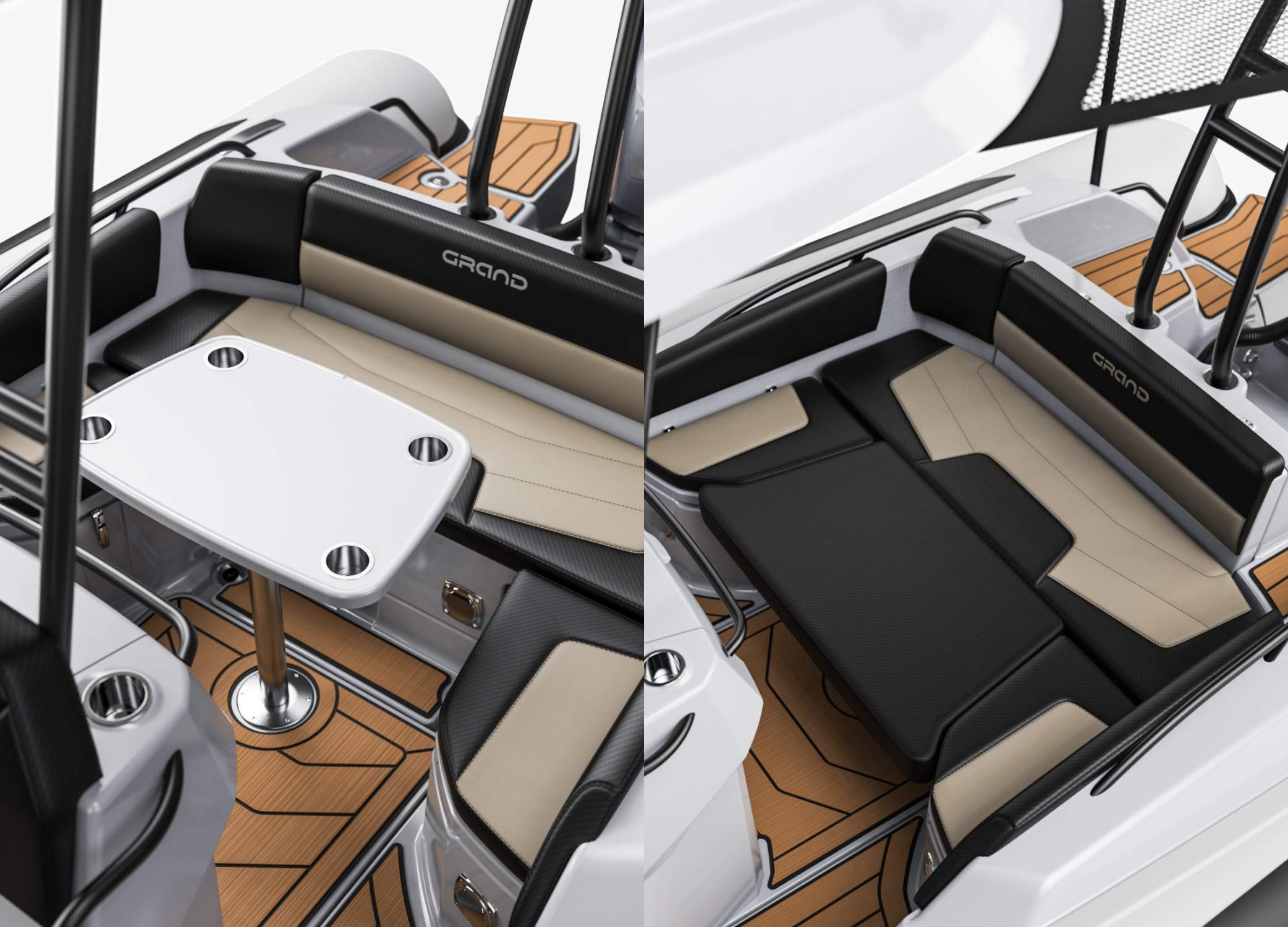 With maximised space at the stern of the Grand G750, the area is yours to truly unwind in whilst out on the water. The removable stern table creates a great spot to gather friends for a meal or drink. Lower this table down and add an additional cushion on top and you will find a large stern sun bed area for ultimate boating relaxation.