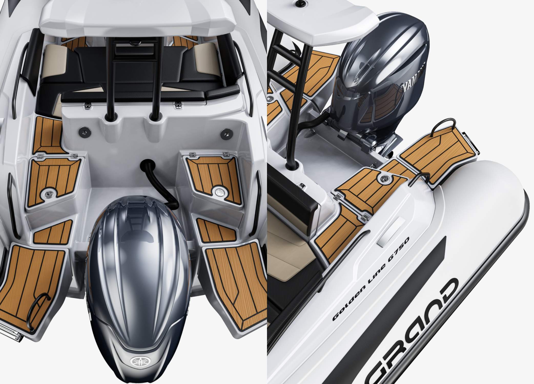 With its hypalon tubes, fibreglass hull, and power rating up to 250HP, the Grand G750 is a modern, open, luxury rigid inflatable boat that brings comfort, functionality and power to your water adventures. Stylish in its design and appearance, and rich in premium features and comforts, this large RIB boat redefines the luxury experience for performance boats.