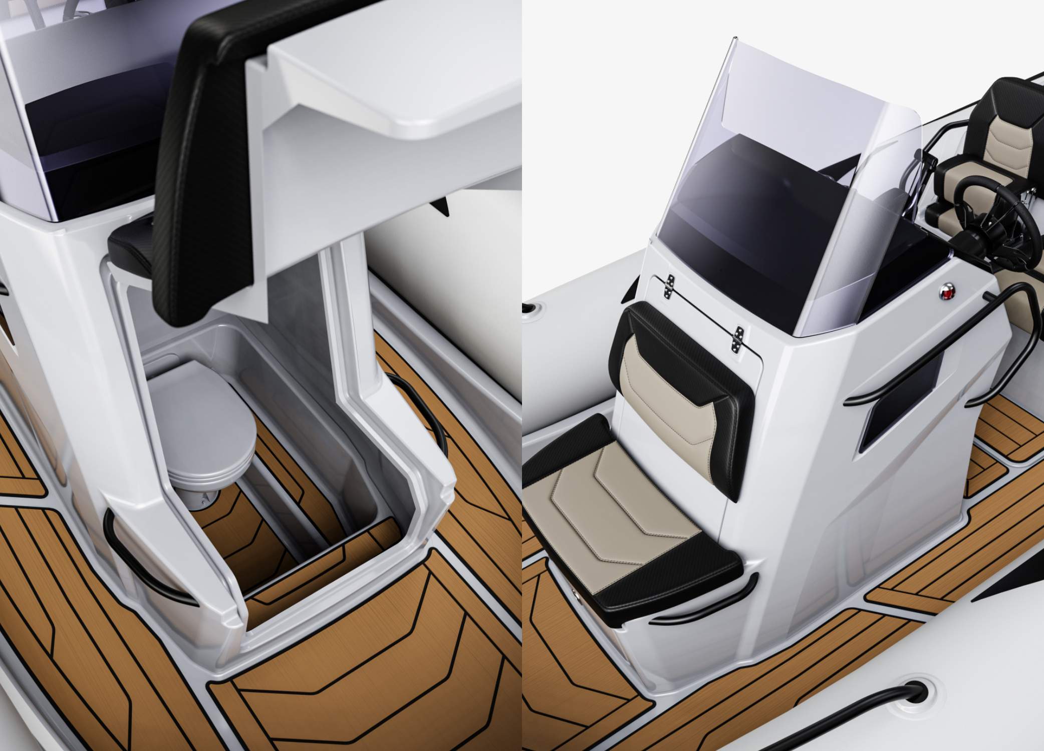 For longer trips on the water, passengers can find comfort in the fitted electric toilet with holding tank, situated underneath the central console.