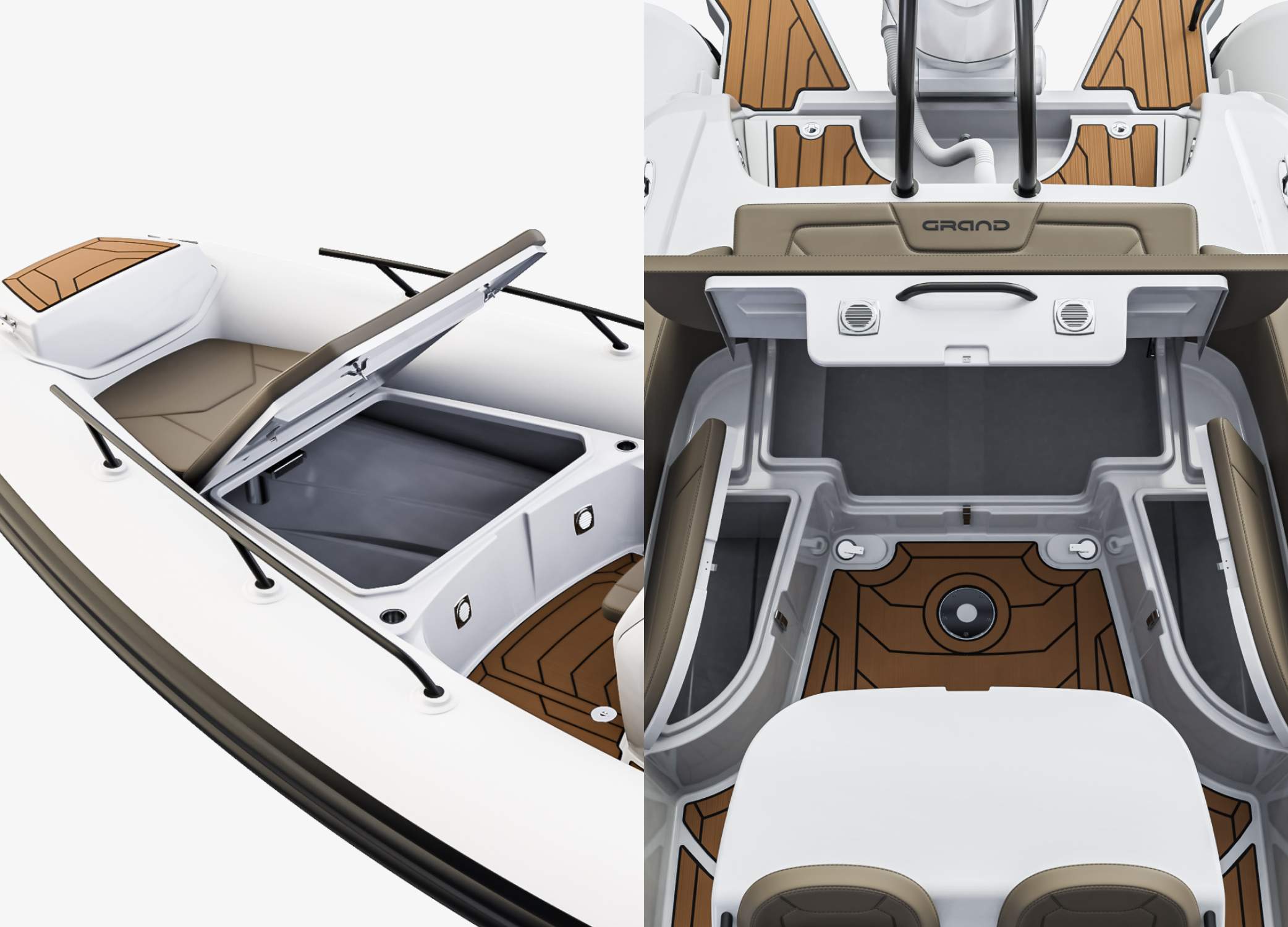 Pack the adventure away easily and without a fuss thanks to the ample storage areas throughout the Grand G850. At the stern, you’ll find storage lockers underneath all of the stern passenger seats. Up at the bow, you’ll find two additional storage lockers underneath the bow sun bed.