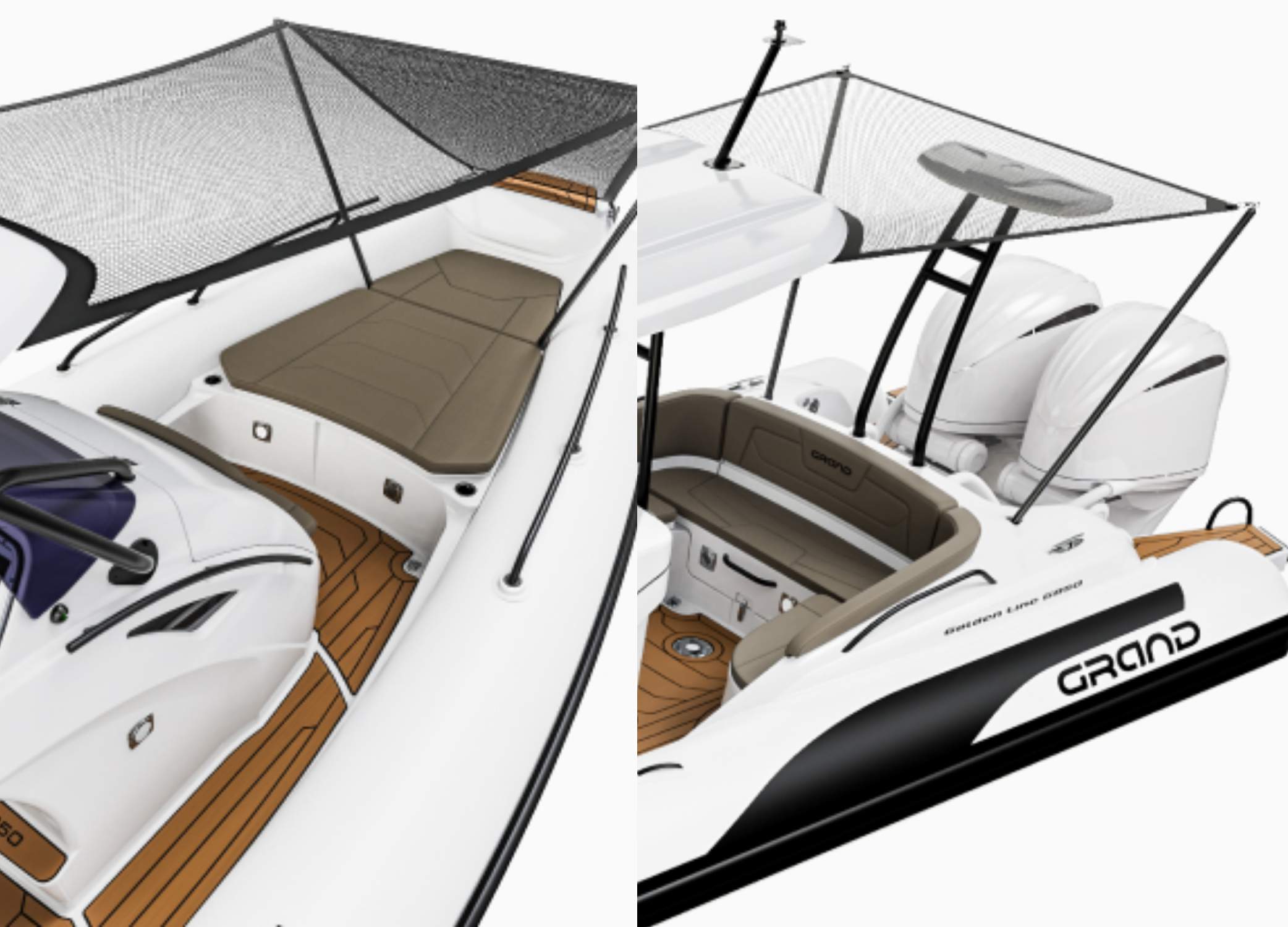 The Grand G850 is a luxurious and spacious 8.5m (28ft) rigid inflatable boat, providing smooth, comfortable and safe navigation for offshore island-hopping adventures. The centre console rigid inflatable boat combines elevated styling with a high-performance ergonomic design. With a deep-v fibreglass hull and hypalon tubes, this boat provides a stable, comfortable and smooth ride. You’ll find countless comfort features on board – including an electric toilet, fibreglass t-top, fridge-freezer and shower, tap and sink, and more – all of which help make this a centre console boat perfect for family adventures on the water.