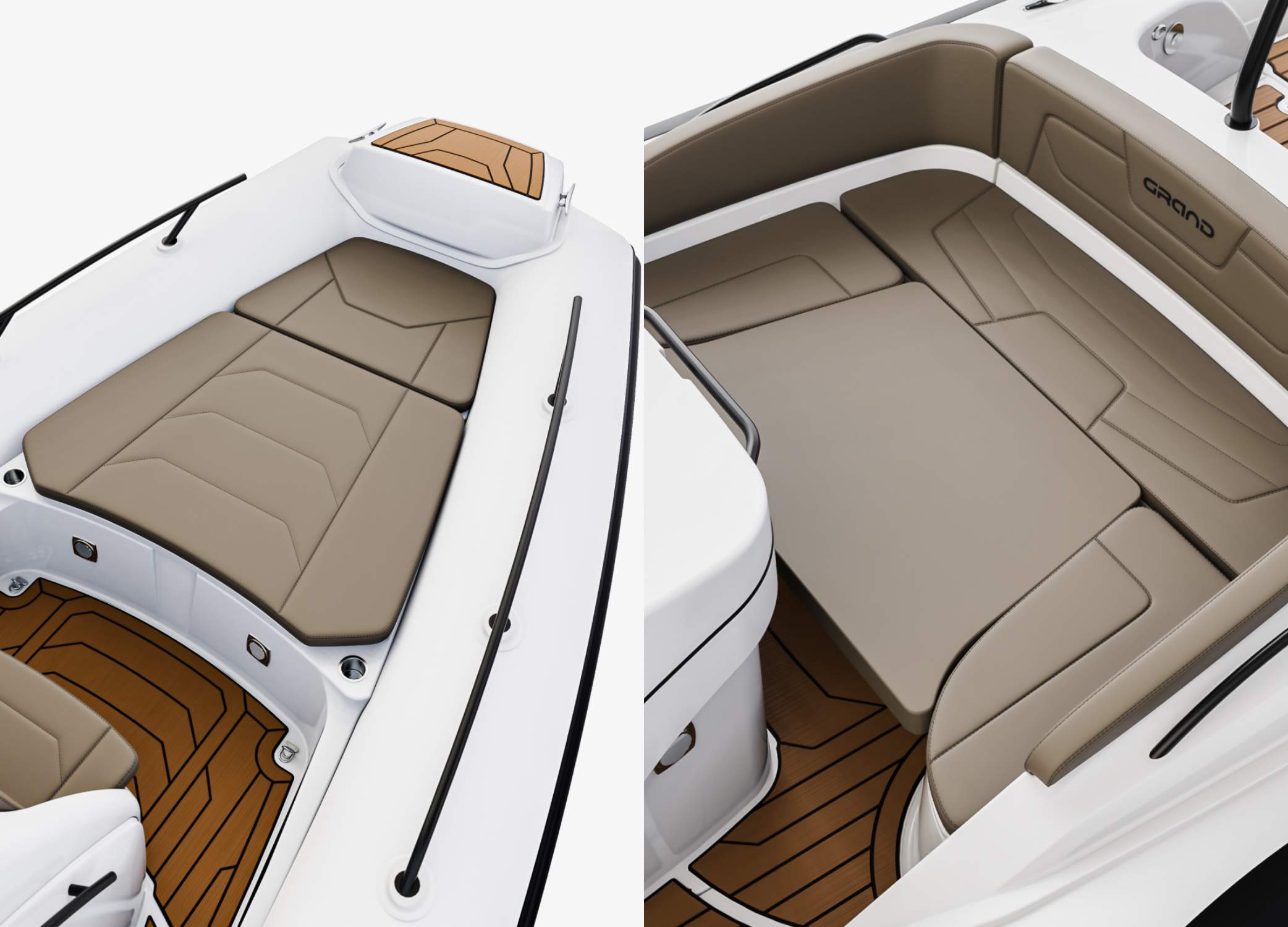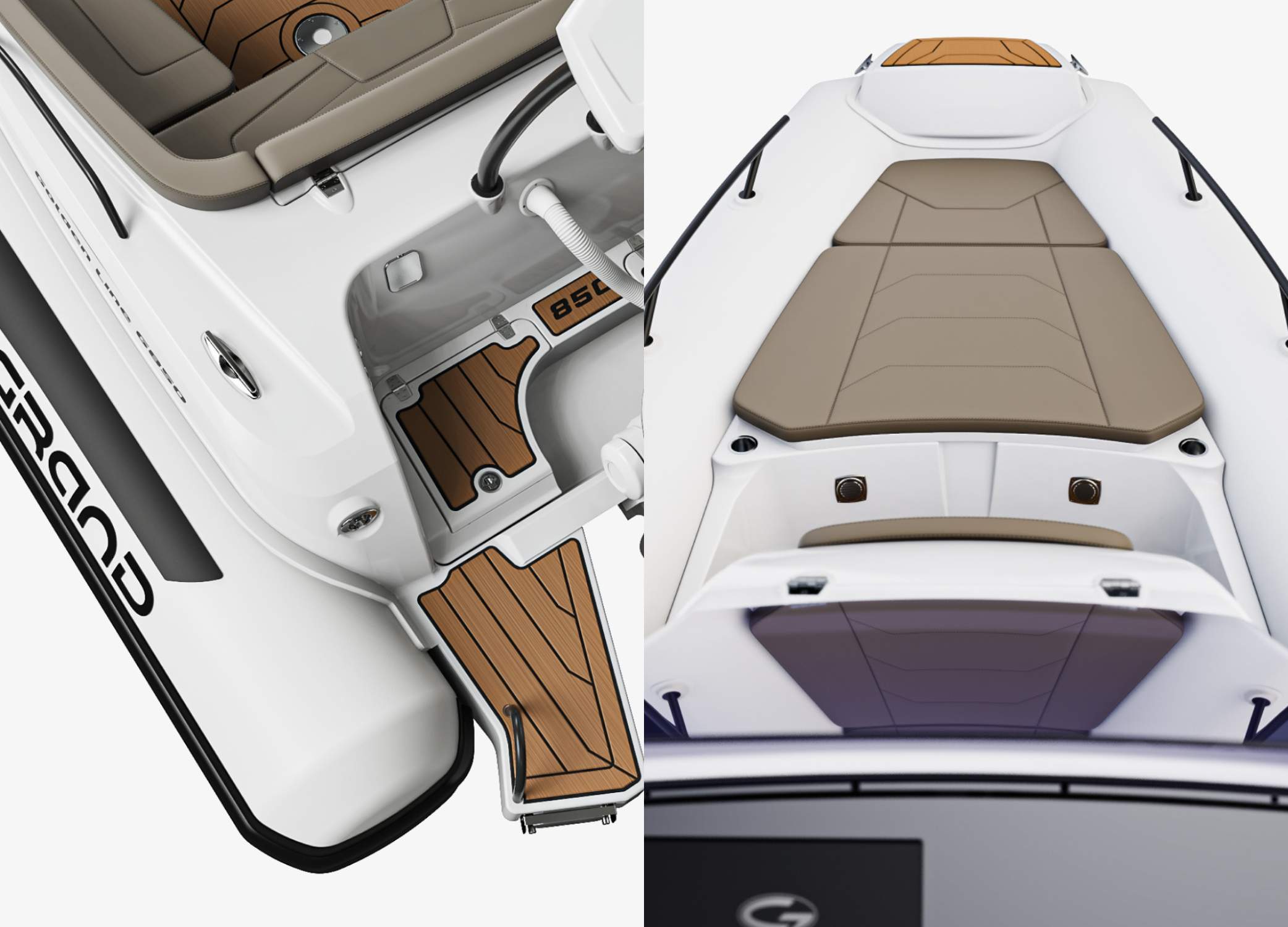 Embarking and mooring can be done comfortably and confidently thanks to the Grand G850’s practical design. The bow step plate creates a stable platform to climb onboard the bow and features mooring cleats and an anchor roller. Down at the stern, wide and stable platforms create a comfortable step up onto the boat, whether you’re embarking from a pontoon or beach.