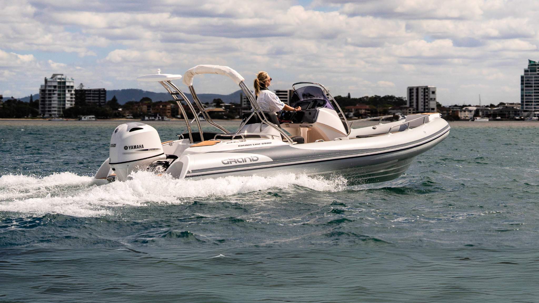 Our 5.8m / 19ft rigid inflatable boat with its fibreglass deep-V hull and sleek hypalon tubes is power rated up to 150HP – a perfect choice for family cruising, offshore adventures, or waterskiing. The Grand G580 is compact but versatile, with a centre console that creates easy manoeuvrability, and spacious seating throughout that allows passengers to sit comfortably whilst travelling and relaxing.