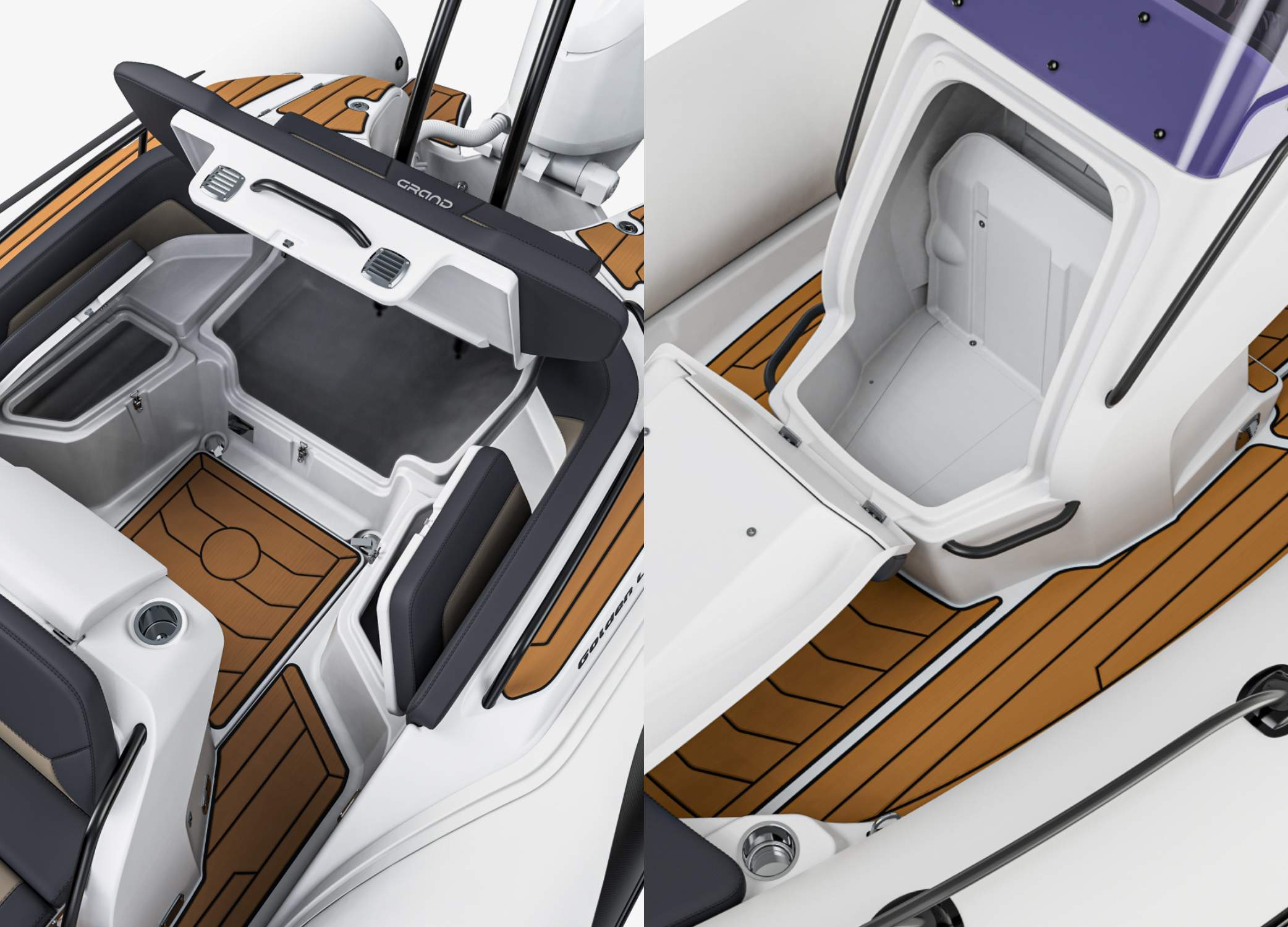 Pack the adventure away easily and without a fuss thanks to the ample storage areas throughout the Grand G680. At the stern, you’ll find storage lockers underneath all of the u-shaped passenger seating, while at the bow, you’ll find two additional storage lockers underneath the bow sun bed. The additional seat in front of the console also opens up to reveal an additional storage compartment.