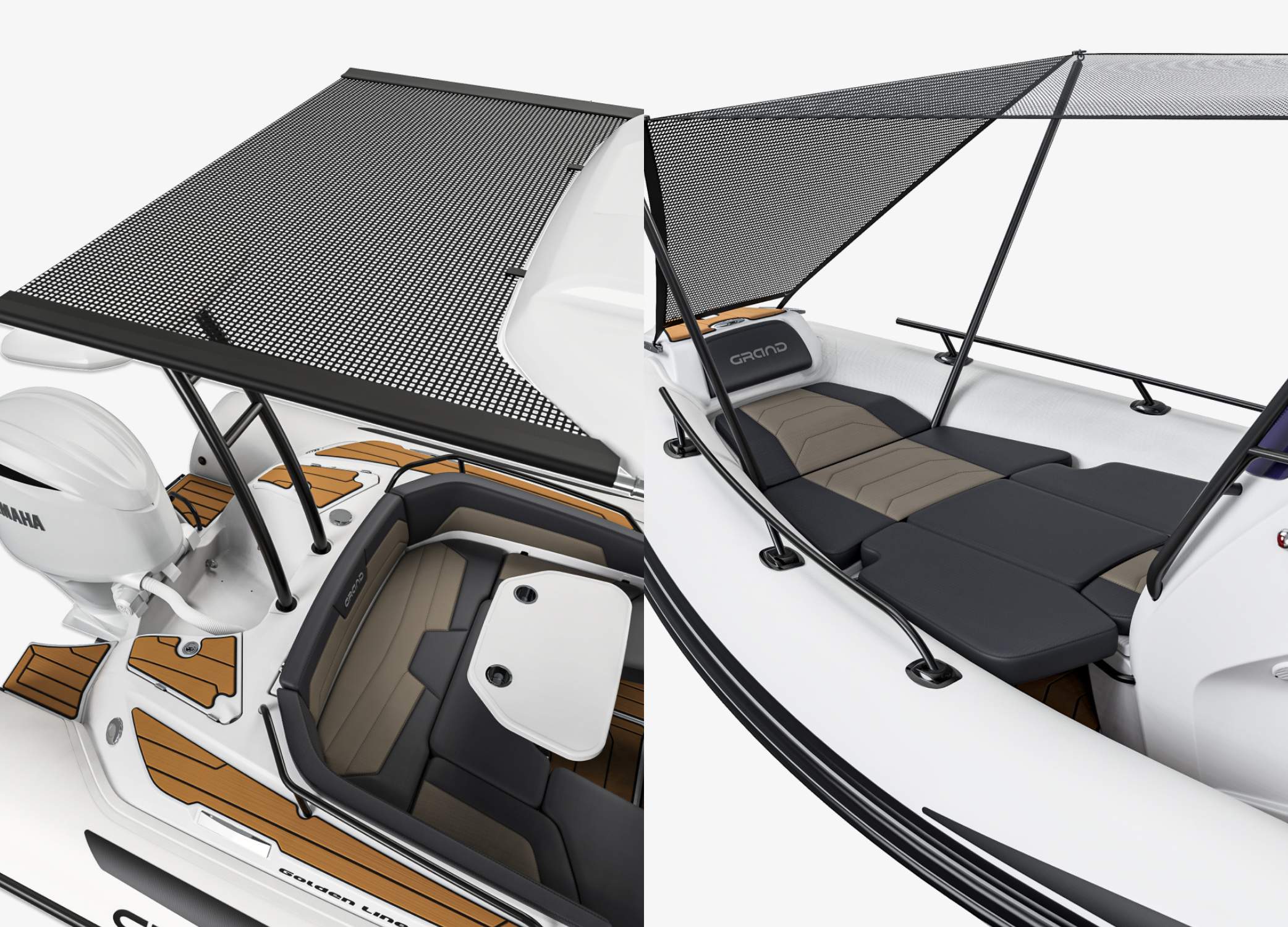 The extensive fibreglass t-top onboard the Grand G680 provides considerable shade and protection from the sun while underway and when moored. The optional sun shade extensions that extend out over the bow and stern provide additional sun protection.Â