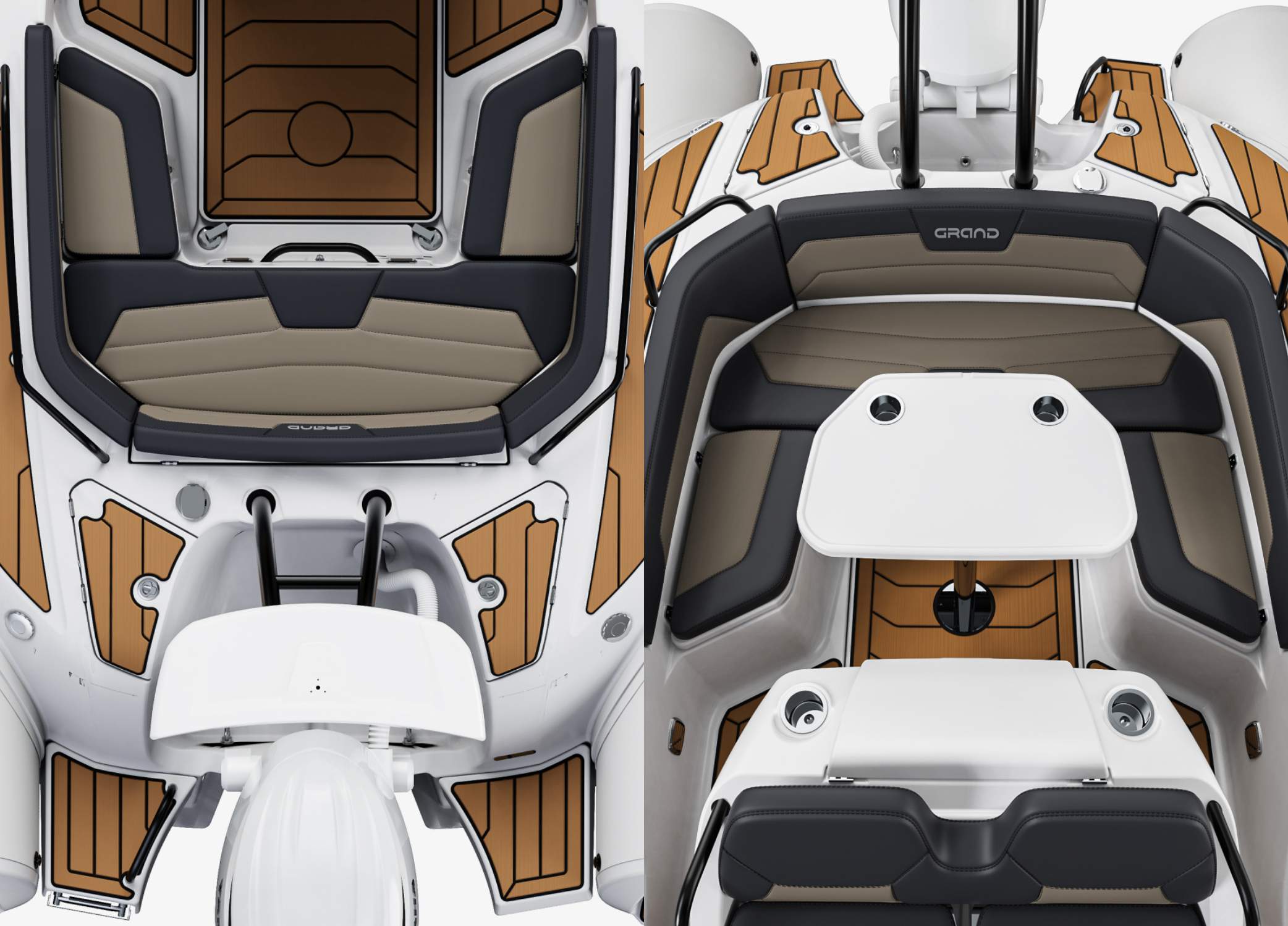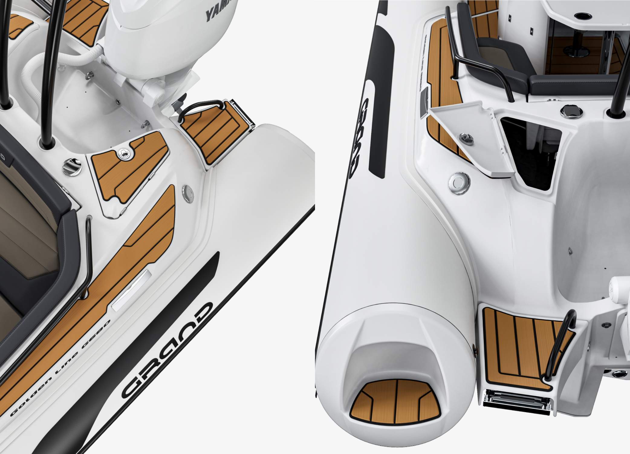Embarking and mooring can be done comfortably and confidently thanks to the Grand G680’s intentional design approach. The bow step plate creates a stable platform to climb onboard the bow and features mooring cleats and an anchor roller. Down at the stern, wide and stable swimming platforms and tube step ends create a comfortable step up onto the boat, whether you’re embarking from a pontoon or beach.Â
