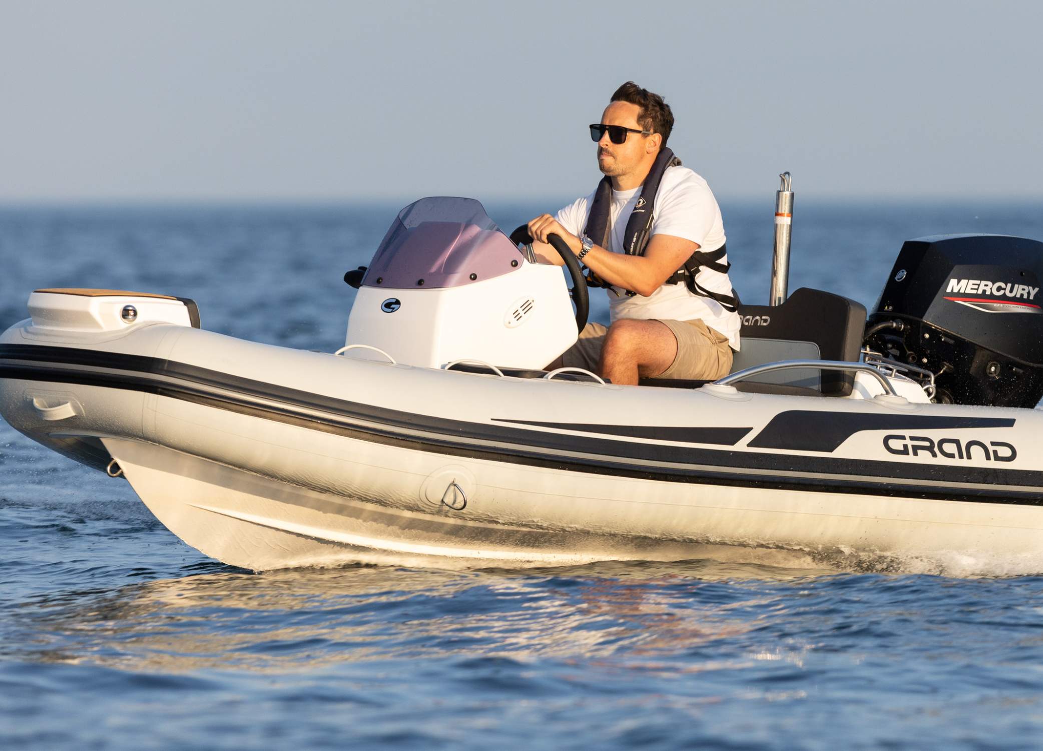 Featuring deep-set rear seats, an optional side seat and a low profile console, manoeuvrability onto and around the Grand G340 boat is relaxed and easy. Storage is maximised with lockers at the stern and bow of the boat, allowing this rigid inflatable boat to serve effectively not only for first class transfer, but also for fishing, small family outings, day trips and more. With the option of a ski pole too, this agile and ergonomic RIB is perfect also for waterskiing and wakeboarding.